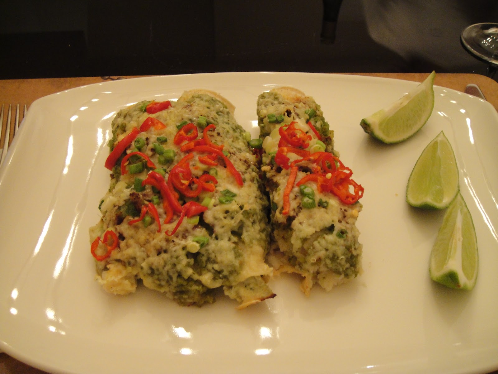 I've been making these green enchiladas for years. I wrote a post about them about a year ago. They were one of the first dishes I started making regularly while learning how to cook, and the first from-scratch enchiladas I ever made. Back in the day, I used canned enchilada sauce and I thought I was a cooking wizard because I could bake enchiladas in the oven that came out still resembling their ingredients instead of gooey charcoal. Bonus points for being tasty! I think that in the past year, I've perfected them and wanted to post my updated recipe.